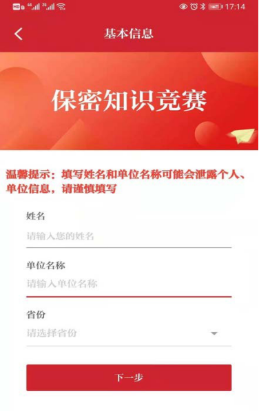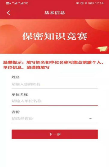 2.点击考试栏目,进入考试界面,填写“姓名”“单位名称”,选择“省份”,点击“下一步”开始考试。(姓名可填昵称,单位名称请填写:0638太阳集团官网)。