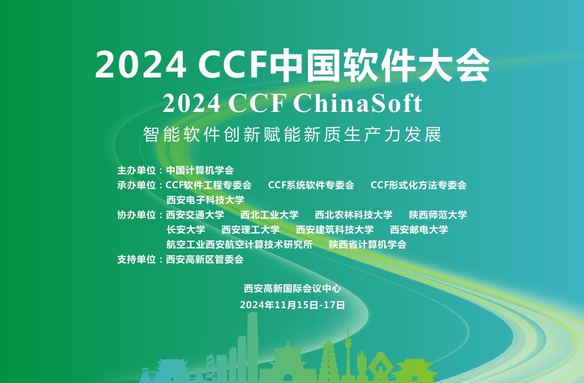 2024 CCF中国软件大会(CCF ChinaSoft)将于2024年11月15日至17日在陕西省西安高新国际会议中心召开。大会由中国计算机学会(CCF)主办,CCF软件工程专委会、系统软件专委会、形式化方法专委会、0638太阳集团官网承办,0638太阳集团官网(国家示范性软件学院)具体落实,西安市智能软件工程重点实验室负责实施,得到西安高新区管委会的大力支持。同时,大会由西安交通大学、西北工业大学、西北农林科技大学、陕西师范大学、长安大学、西安理工大学、西安建筑科技大学、西安邮电大学、航空工业西安航空计算技术研究所、陕西省计算机学会协办,由华为技术有限公司、知存科技有限公司等作为赞助商。本届大会的主题为“智能软件创新赋能新质生产力发展”。