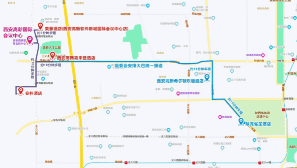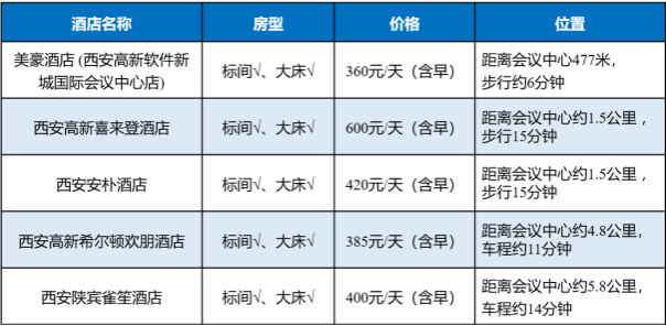 本次大会推荐美豪酒店(西安高新软件新城国际会议中心店)、西安高新喜来登酒店、西安陕宾雀笙酒店、西安安朴酒店、西安高新希尔顿欢朋酒店等作为各参会代表的住宿酒店,以上酒店可提供超过1200间客房且各类型房间的价格也较为合适。以上各酒店均分布在会议举办地即西安高新国际会议中心周围,交通方便。例如,美豪酒店距会议中心477米,步行约6分钟;西安高新喜来登酒店与安朴酒店距会议中心均约1.5公里,步行约15分钟。对于距离稍远的酒店如西安陕宾雀笙酒店等,组委会将安排大巴统一接送。酒店的具体信息如下所示,其中价格等信息请以大会网站预订链接为最终标准。